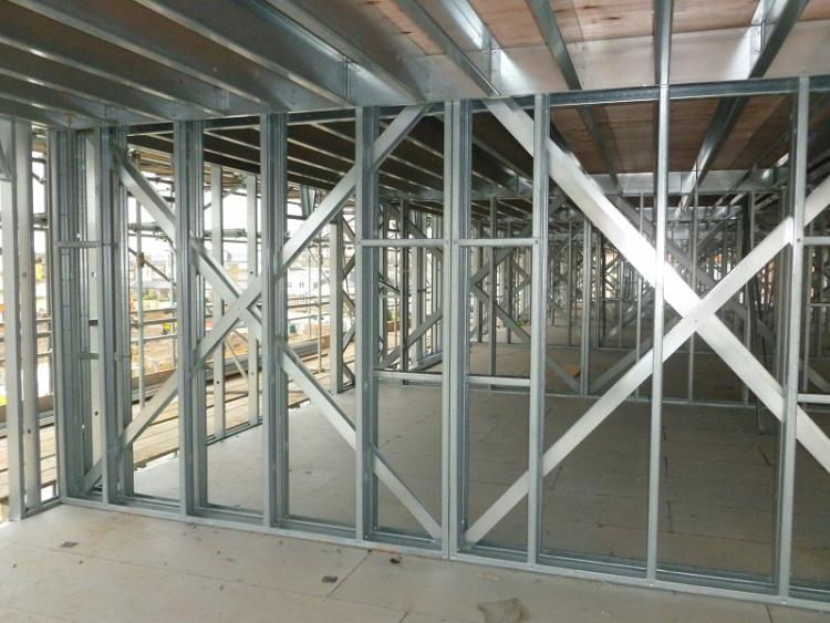 The forthcoming SCI publication P437 will provide guidance on stability systems in LSF using conventional bracing systems to Eurocodes and importantly it permits the use of various types of sheathing board such as cement particle board, cement fibre boards and calcium silicate boards to deliver diaphragm action, provided this is supported by test data on wall panels. Wood-based boards such as OSB3 may also be used subject to constraints of fire resistance to the new Part B of the Building Regulations.